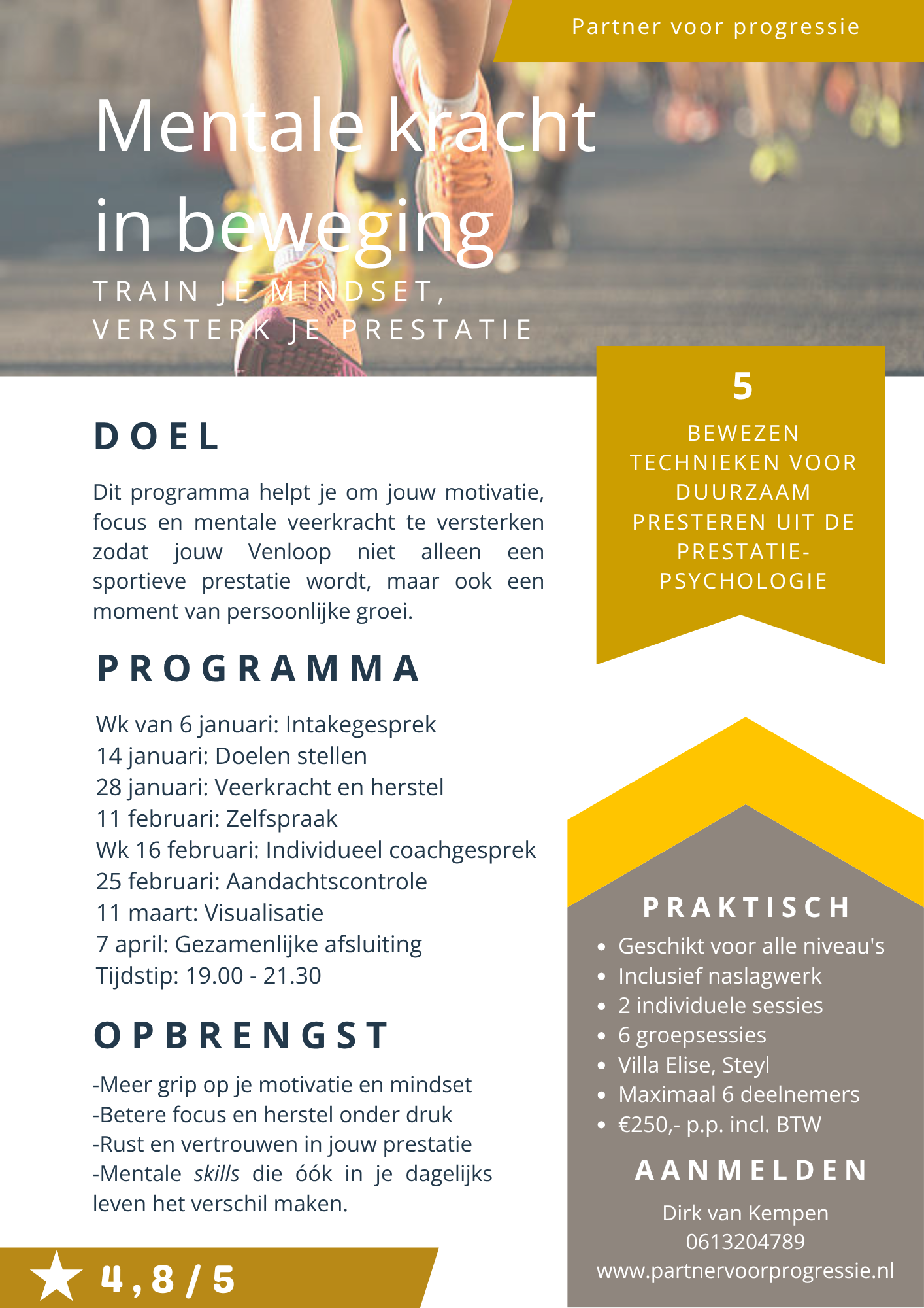In januari 2026 start het programma Mentale kracht in beweging, een individueel traject in groepsverband waarin je leert presteren vanuit rust, focus en vertrouwen.
